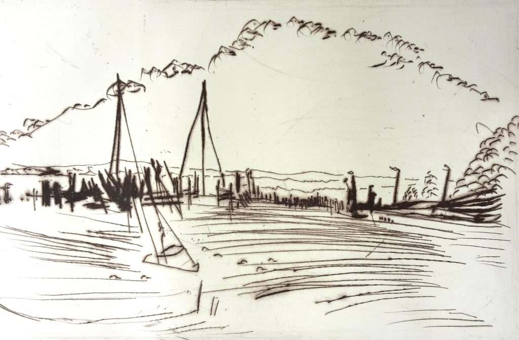 Torsten Schlüter, „Am Hafen in Kloster“, 2012, Kaltnadelradierung,10x15cm