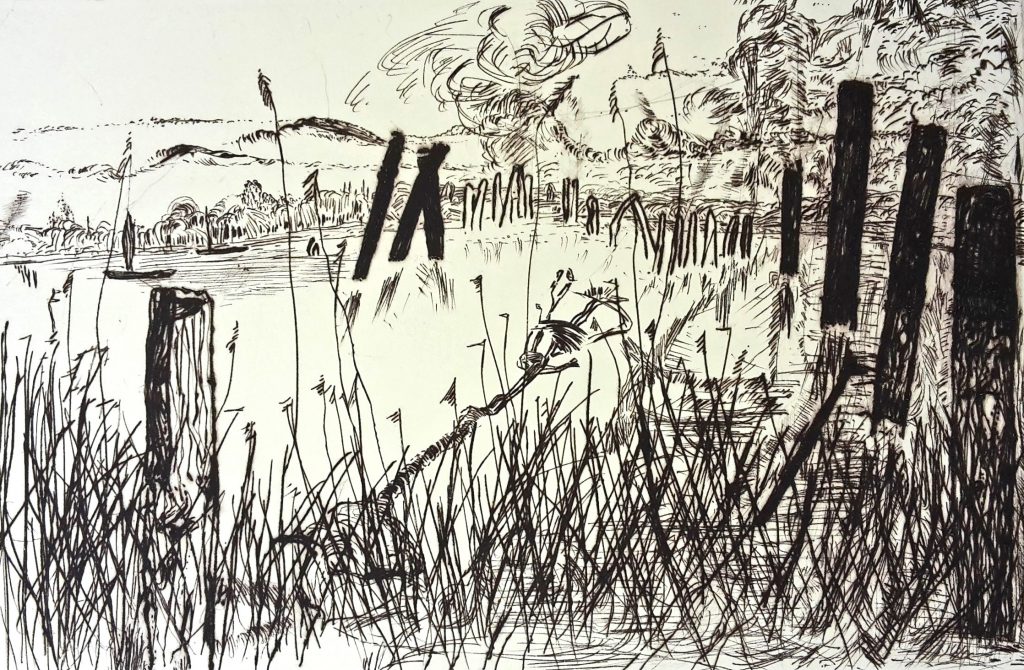 Torsten Schlüter, „Bühne im Schilf“, 2007, Kaltnadelradierung, 20x30cm