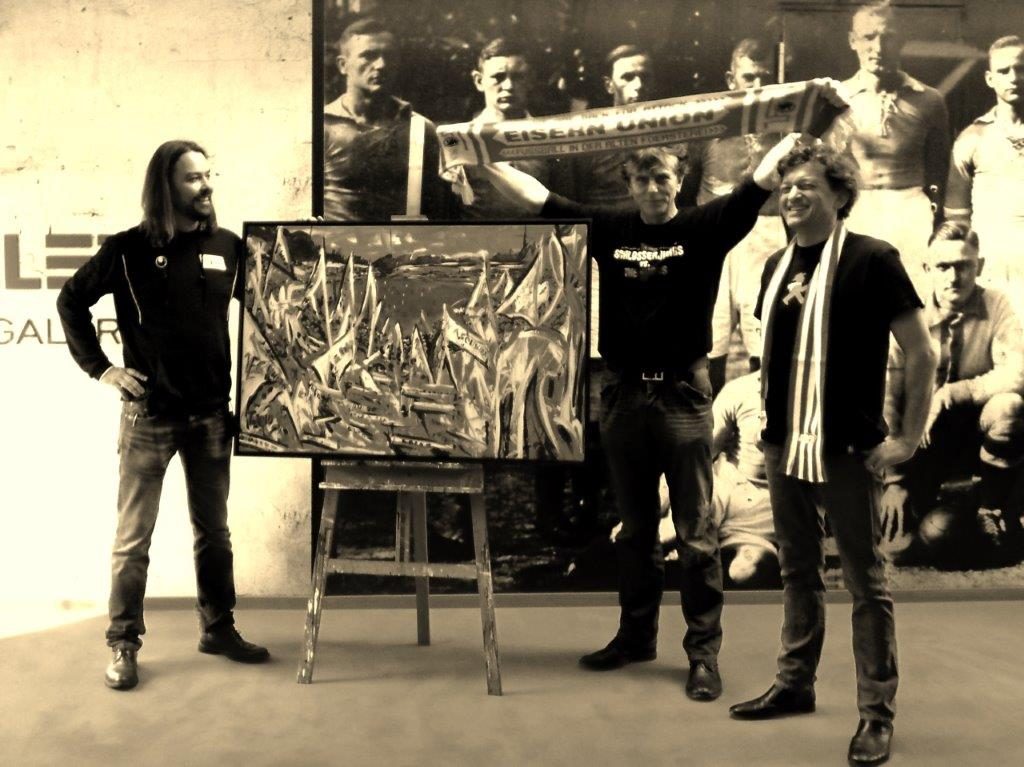 10 Oktober 2016 Torsten Schlüter, Präsentation „Alte Försterei-Fahnenmeer“, Öl auf Leinwand, 2011), Projekt von Ampelmann AG und Torsten Schlüter, Erlös zur Förderung der Nachwuchsarbeit des 1.FC Union, 66 numerierte Leinwanddrucke mit Zertifikat, v.l. Christian Arbeit (Stadionsprecher), Torsten Schlüter, Markus Heckhausen (Ampelmann AG), 2014