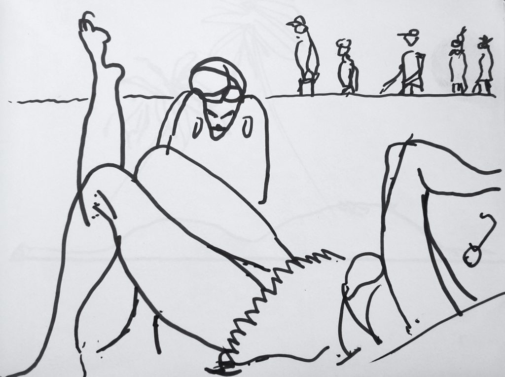 Torsten Schlüter, „Zwei Leiber und Vorübergehende“, 2016, Fineliner, 10x14cm